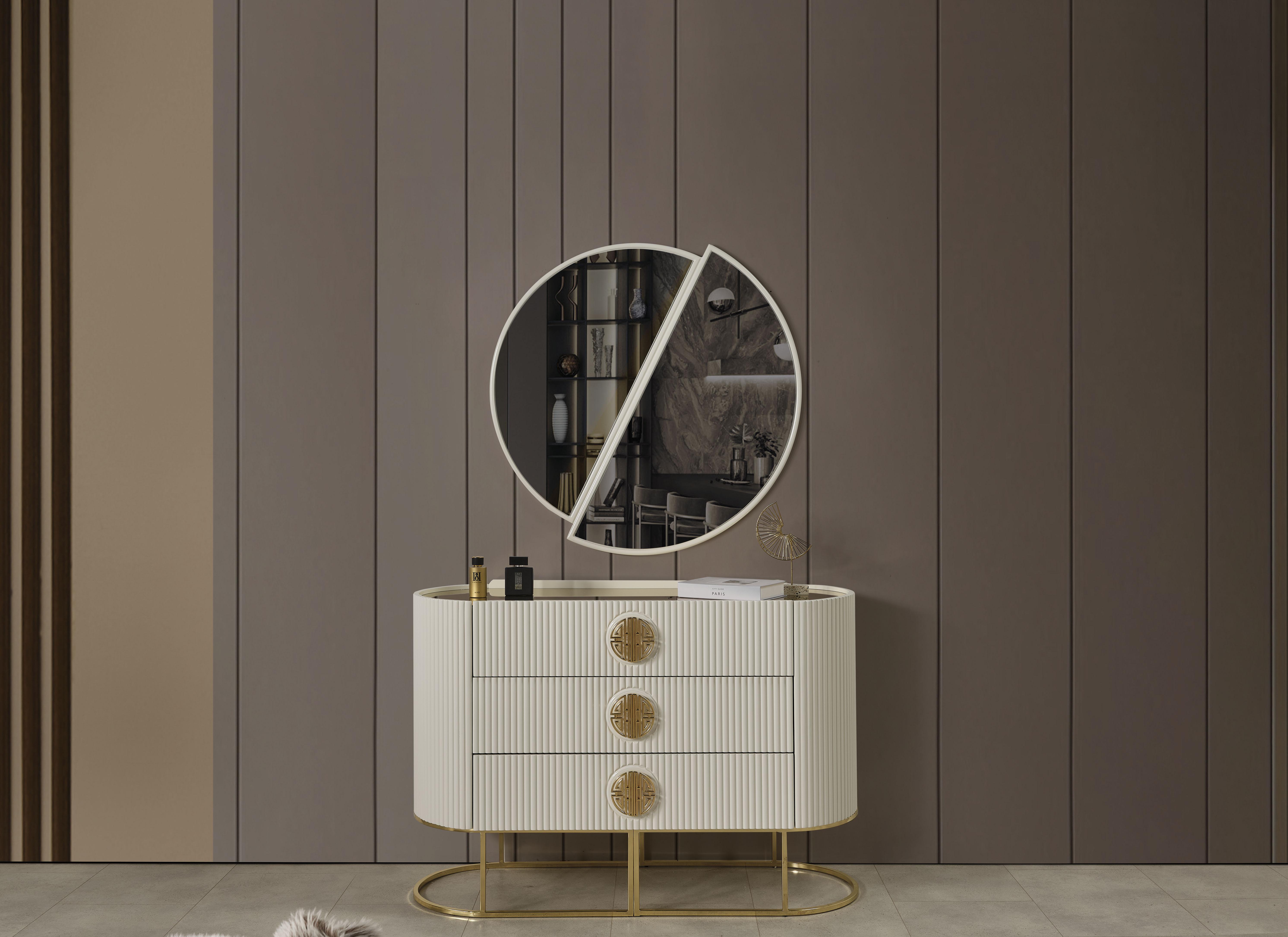 Şifonyer ile uyumlu tasarlanan modern formdaki ayna ise mekâna derinlik ve ferahlık katarak yatak odanızın atmosferini tamamlar. Gold detaylı ayak yapısı ve dengeli tasarım çizgileri, ürünü sadece bir depolama ünitesi olmaktan çıkarıp dekoratif bir mobilya parçasına dönüştürür.