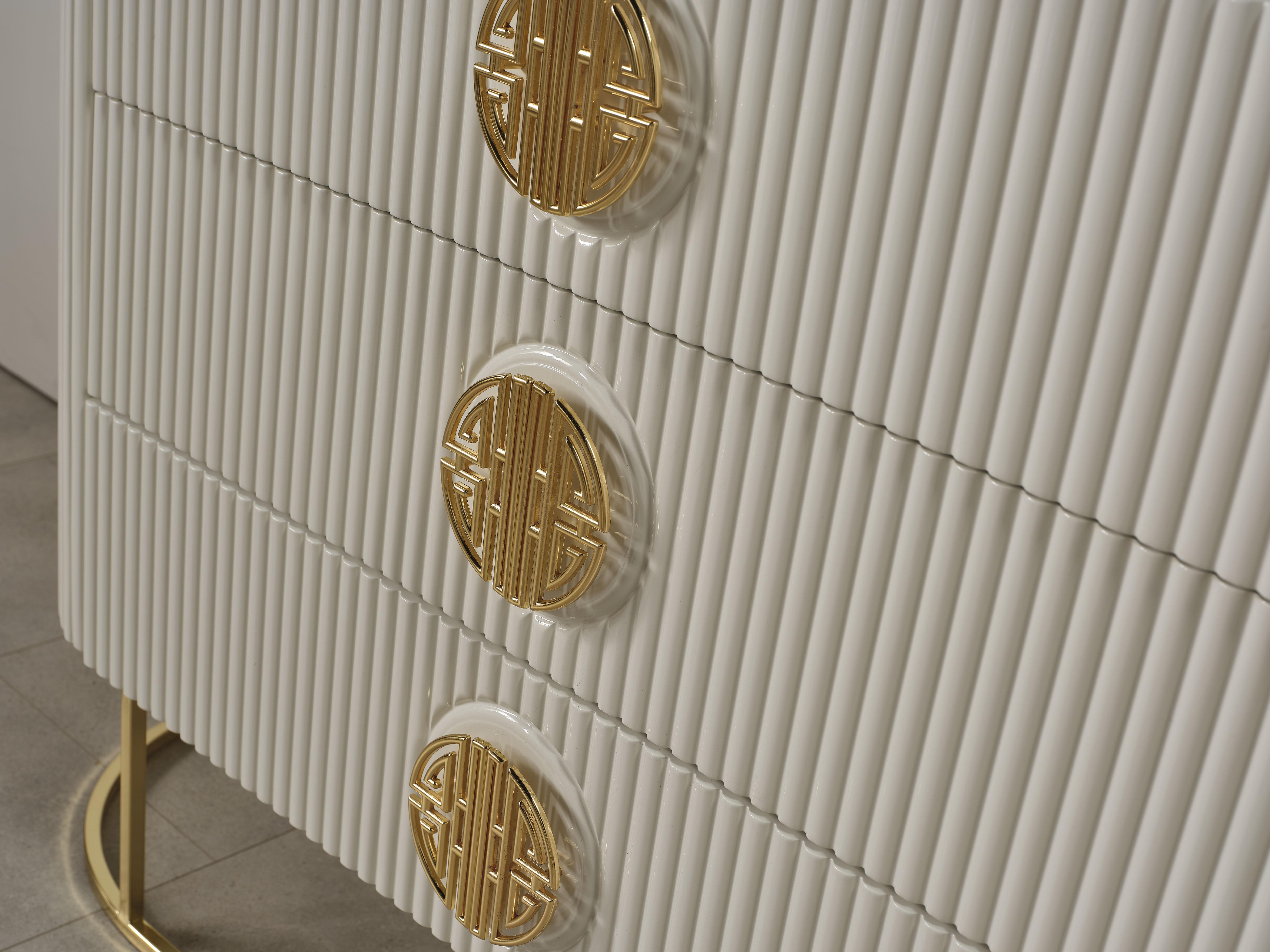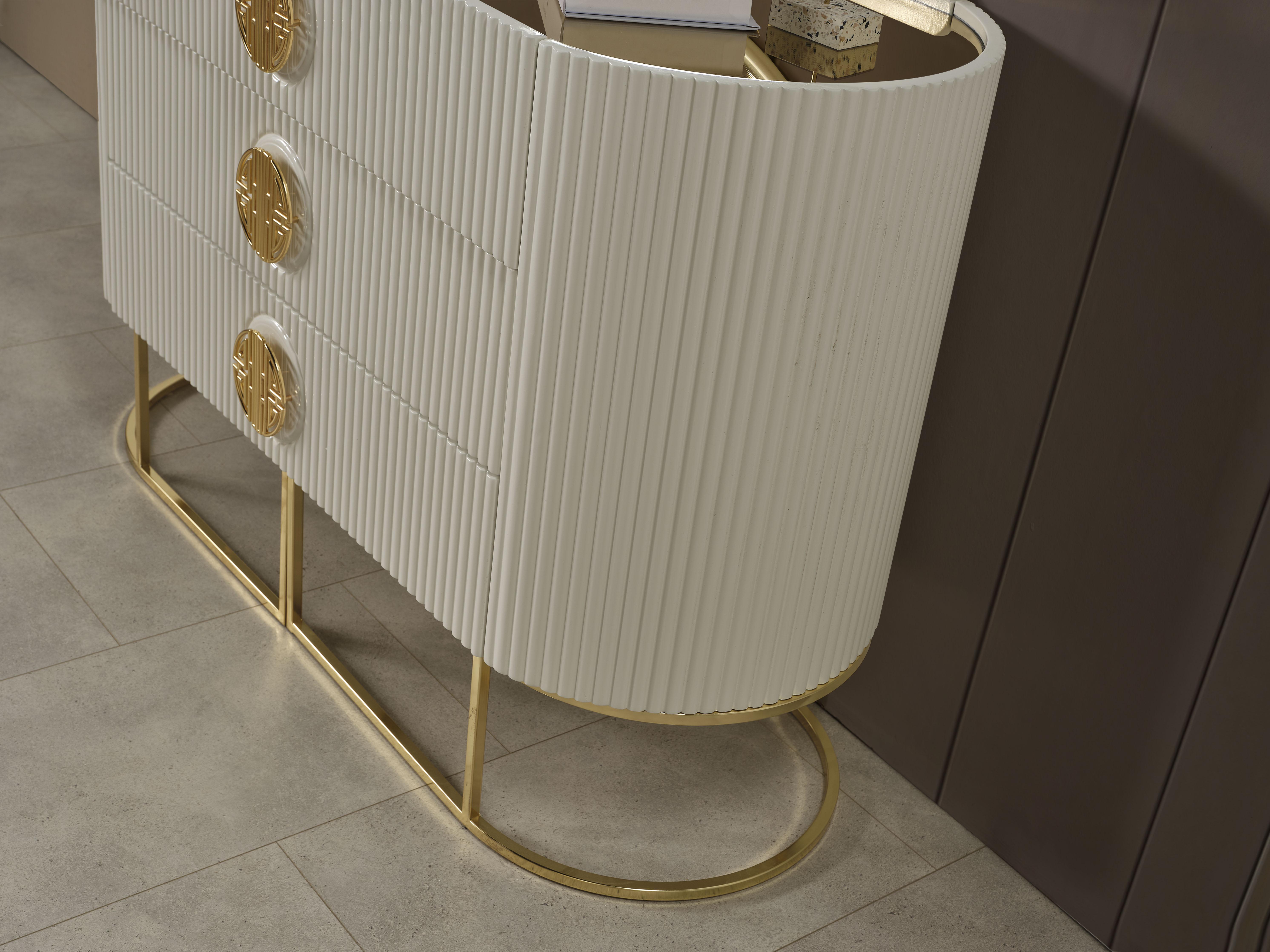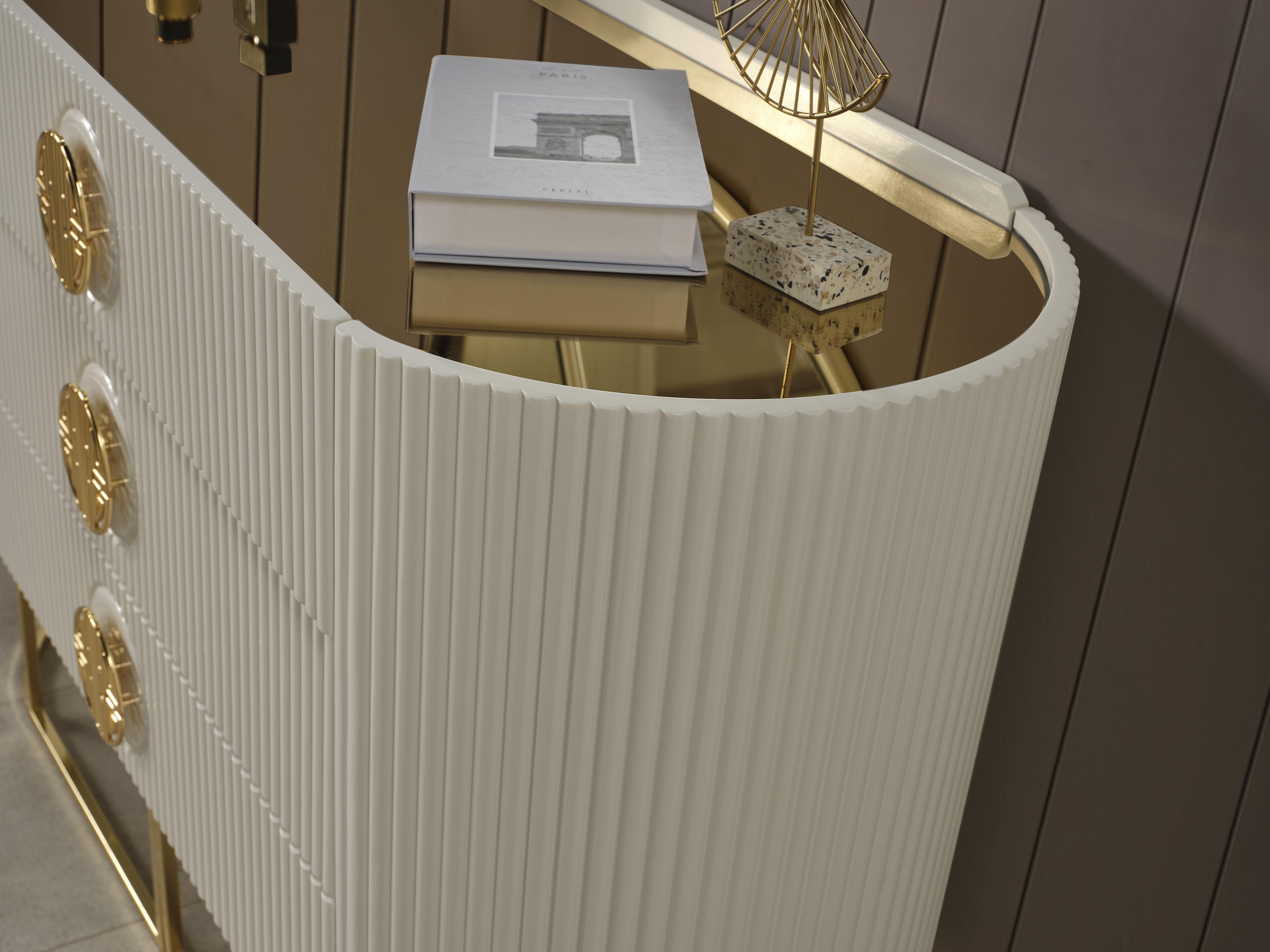Şifonyerin ön yüzeyinde yer alan ince dikey çizgiler ve zarif gold kulp detayları, tasarıma modern bir hareket kazandırırken, üst yüzeydeki şık cam panel hem kullanım kolaylığı hem de estetik bir görünüm sunar. Üç geniş çekmecesi sayesinde kişisel eşyalarınızı, aksesuarlarınızı ve günlük kullanım ürünlerinizi düzenli bir şekilde saklayabilirsiniz.
