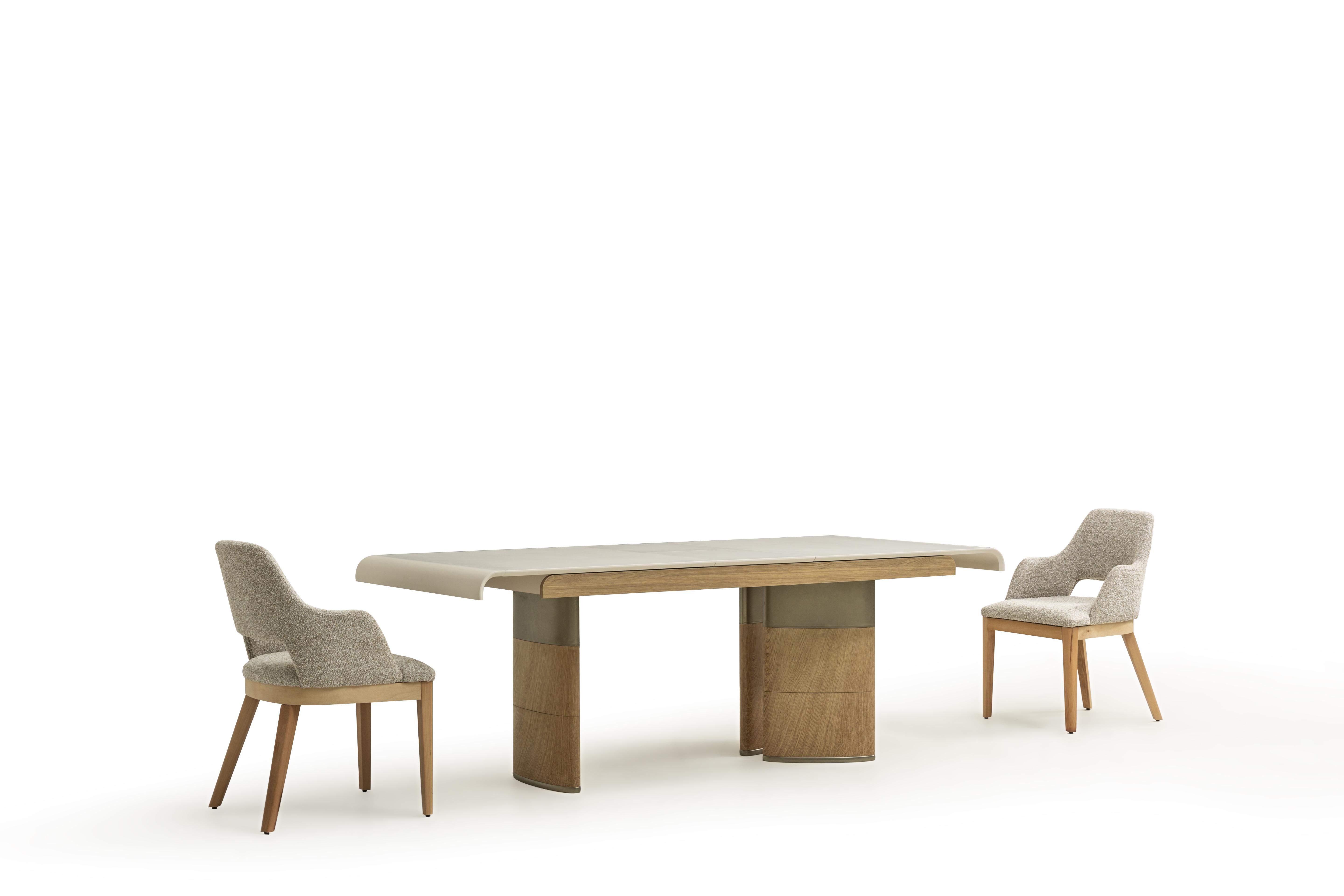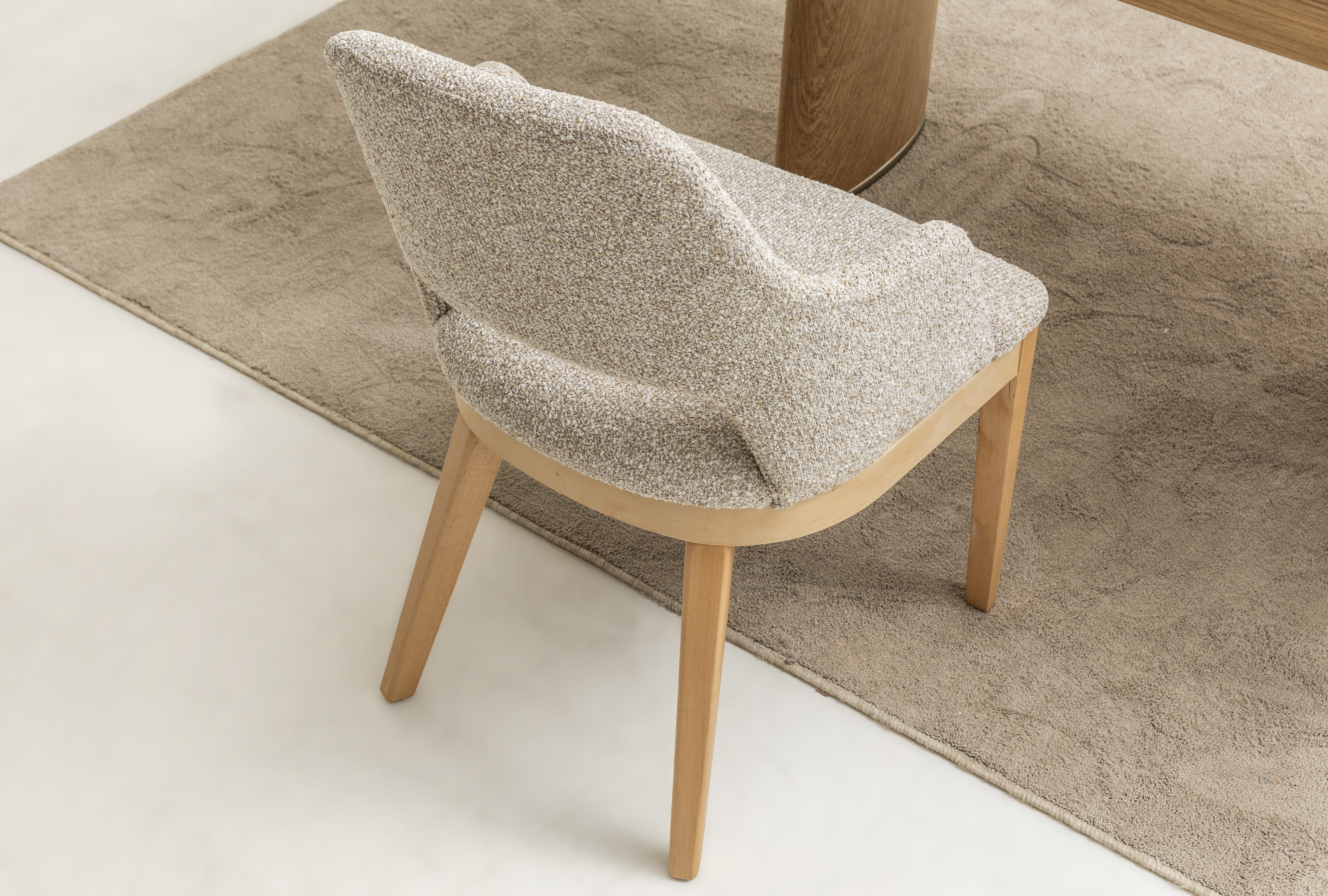 Doğal ahşap ayak yapısı, sandalyeye sıcak ve modern bir karakter kazandırırken sağlam yapısıyla uzun ömürlü bir kullanım sağlar. Kavisli sırt tasarımı vücudu destekleyen ergonomik bir form sunarken, kol destekli yapısı konforu bir üst seviyeye taşır.