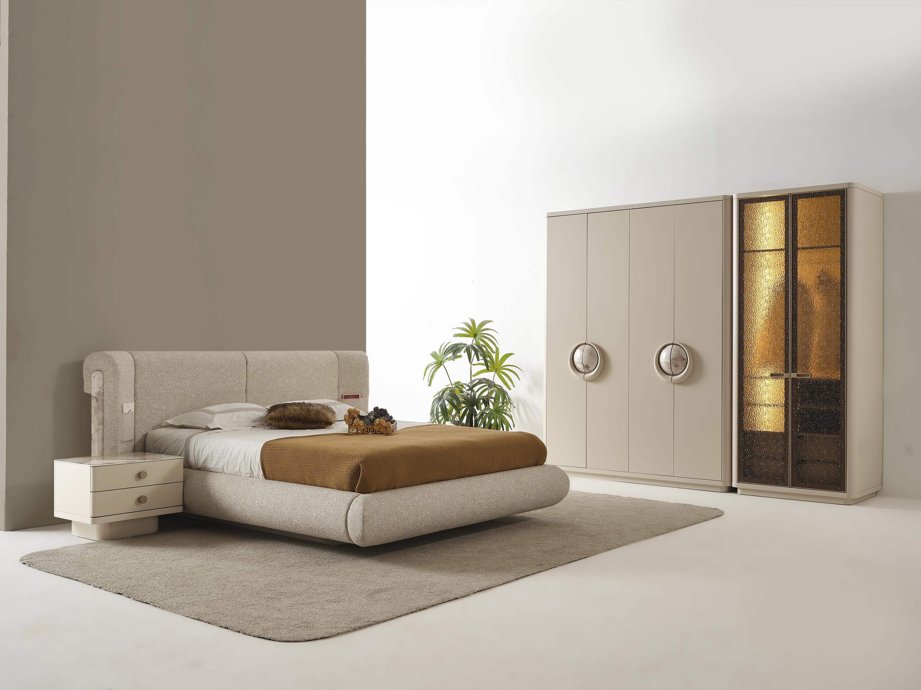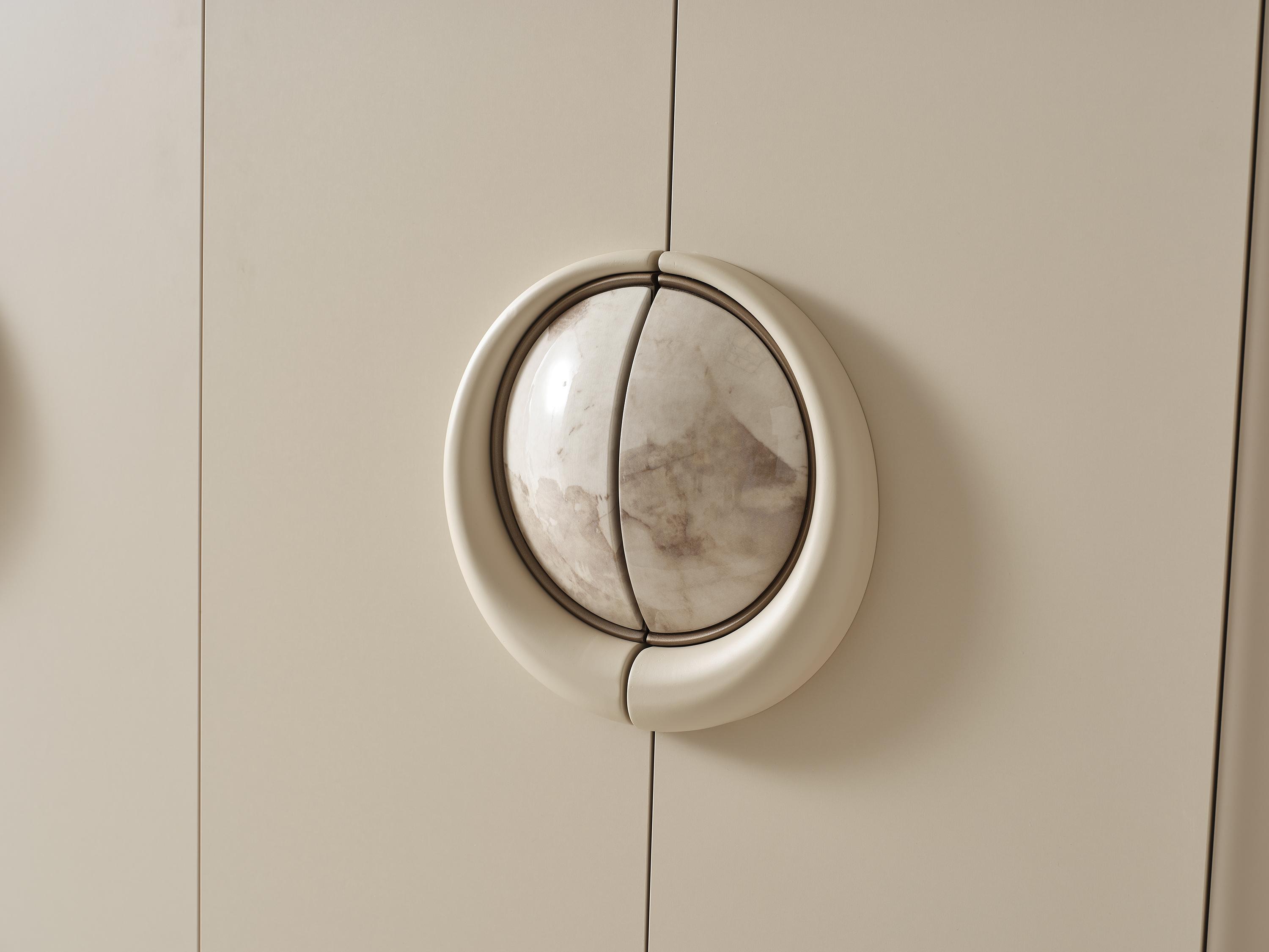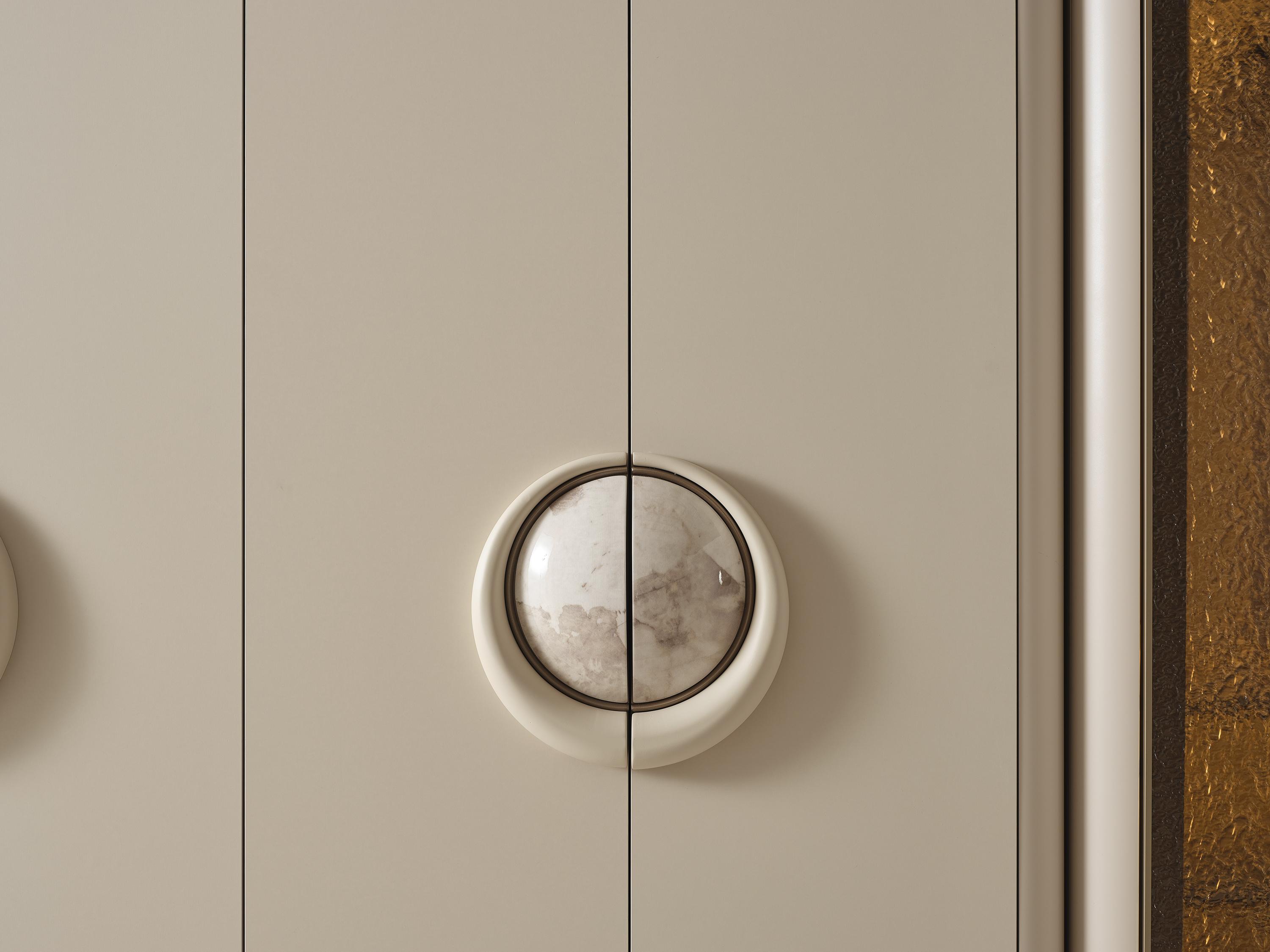 Yumuşak krem tonlarının huzur veren etkisi, yuvarlak formda mermer detaylı kulplarla birleşerek zamansız bir şıklık sunar. Yan modülde kullanılan özel dokulu cam yüzeyler ise iç mekâna sıcak ve ambiyans dolu bir atmosfer kazandırır. Geniş iç hacmi sayesinde tüm eşyalarınızı düzenli ve kolay erişilebilir şekilde saklarken, kaliteli malzeme yapısı uzun ömürlü kullanım sağlar.
