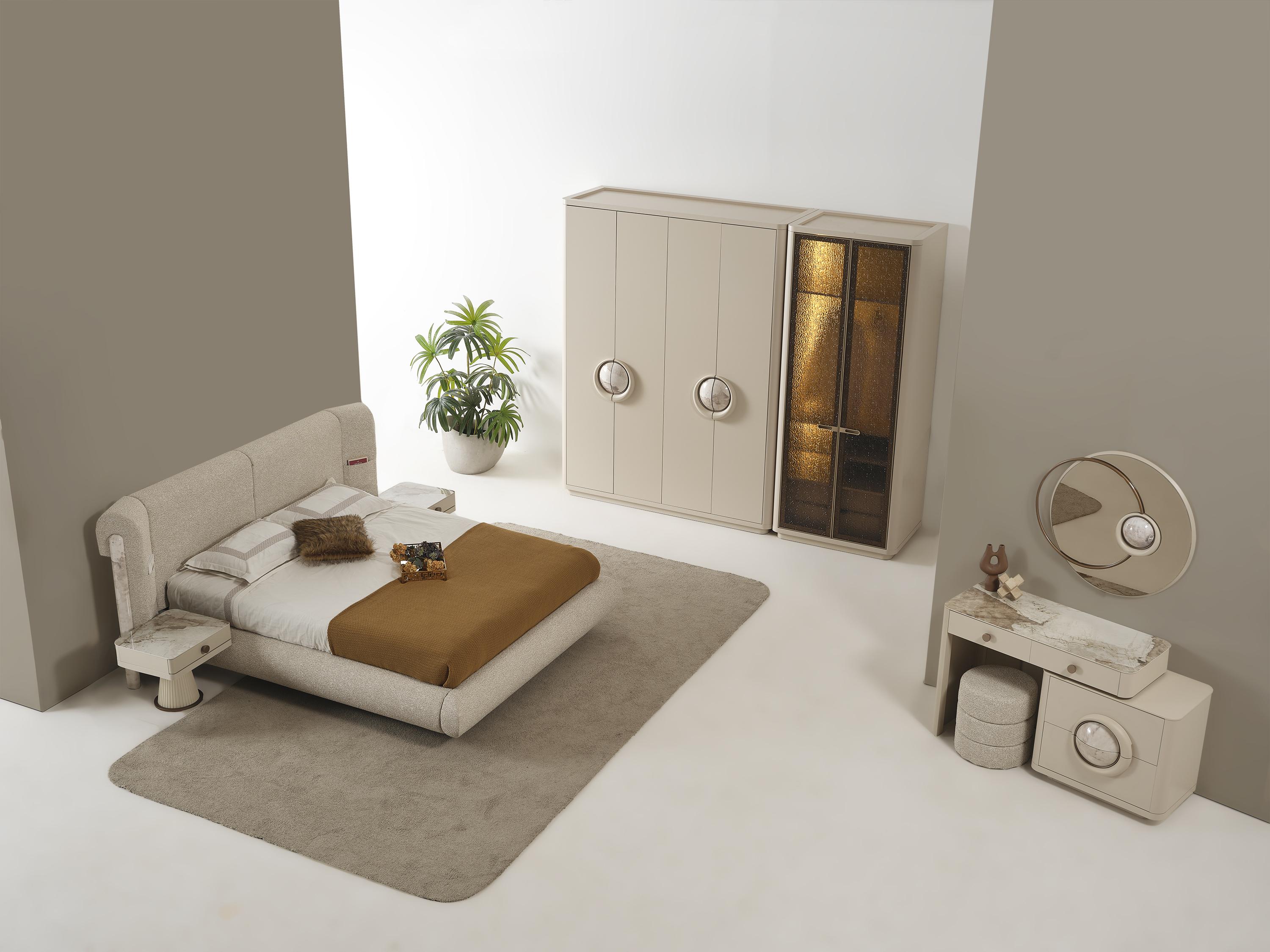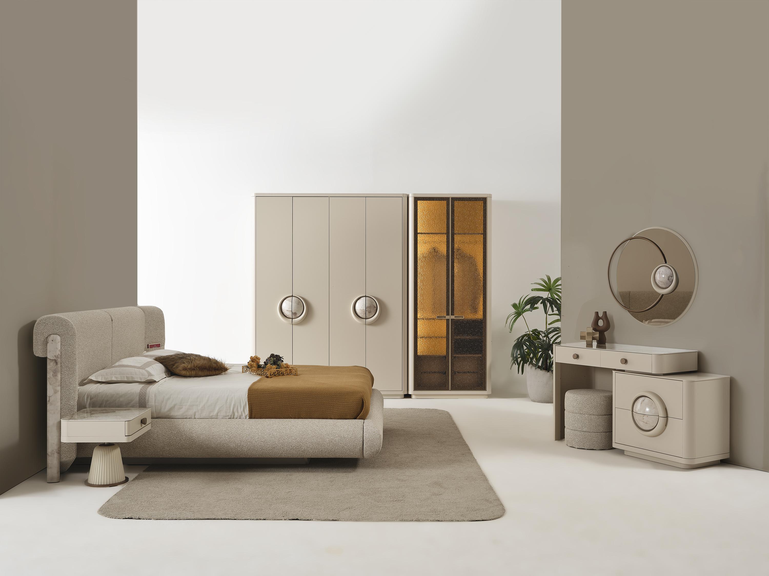 İsviçre’nin rafine yaşam anlayışından ilham alan bu özel koleksiyon; sade, şık ve fonksiyonel detaylarıyla öne çıkar. Geniş ve konforlu yatak yapısı, günün yorgunluğunu geride bırakırken maksimum rahatlık sunar. Modern gardırop tasarımında kullanılan aydınlatmalı cam detaylar ise mekâna derinlik ve sofistike bir atmosfer kazandırır.
