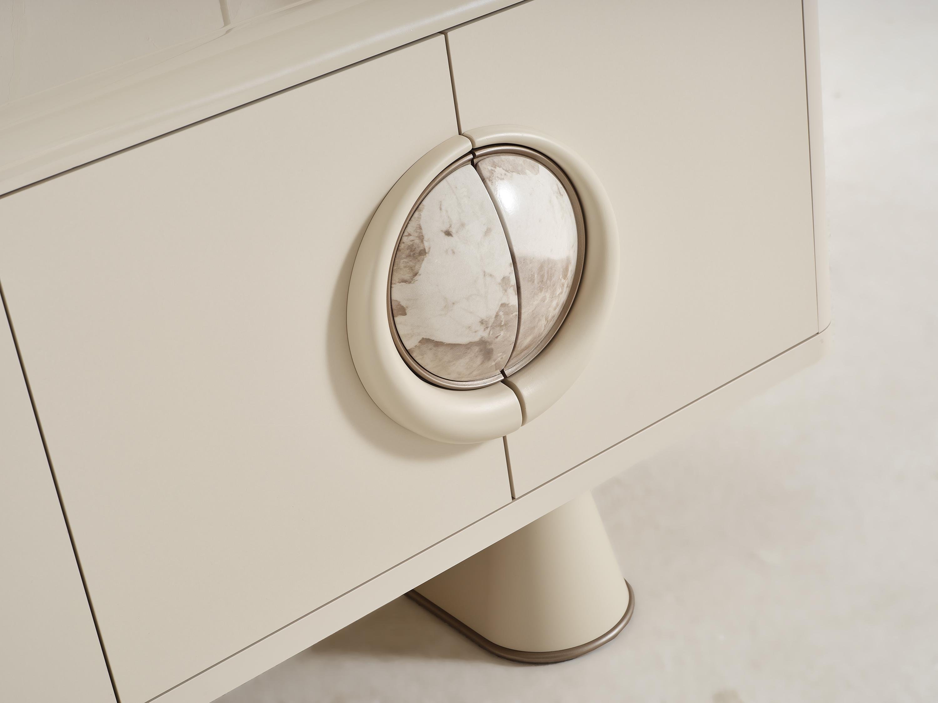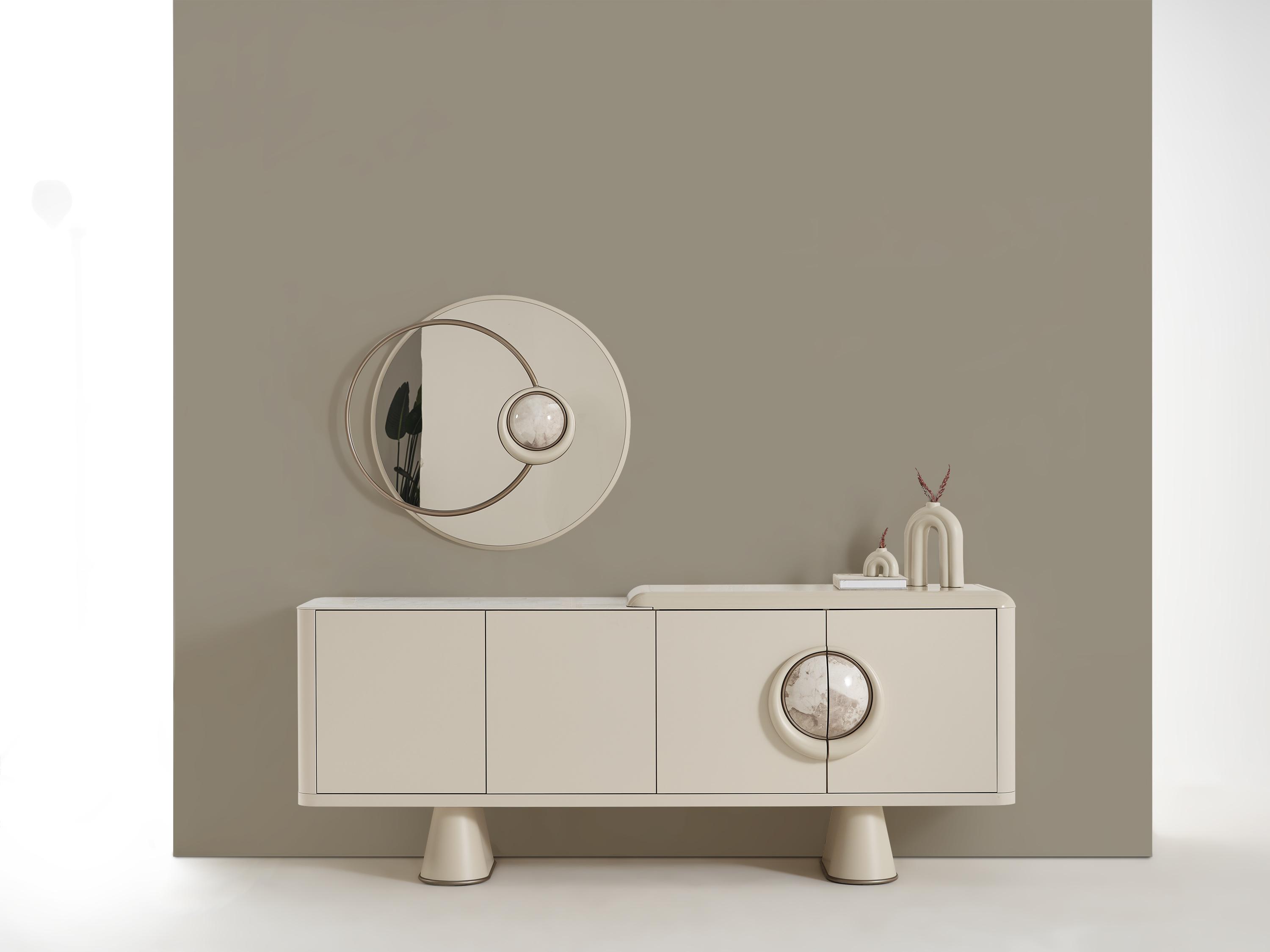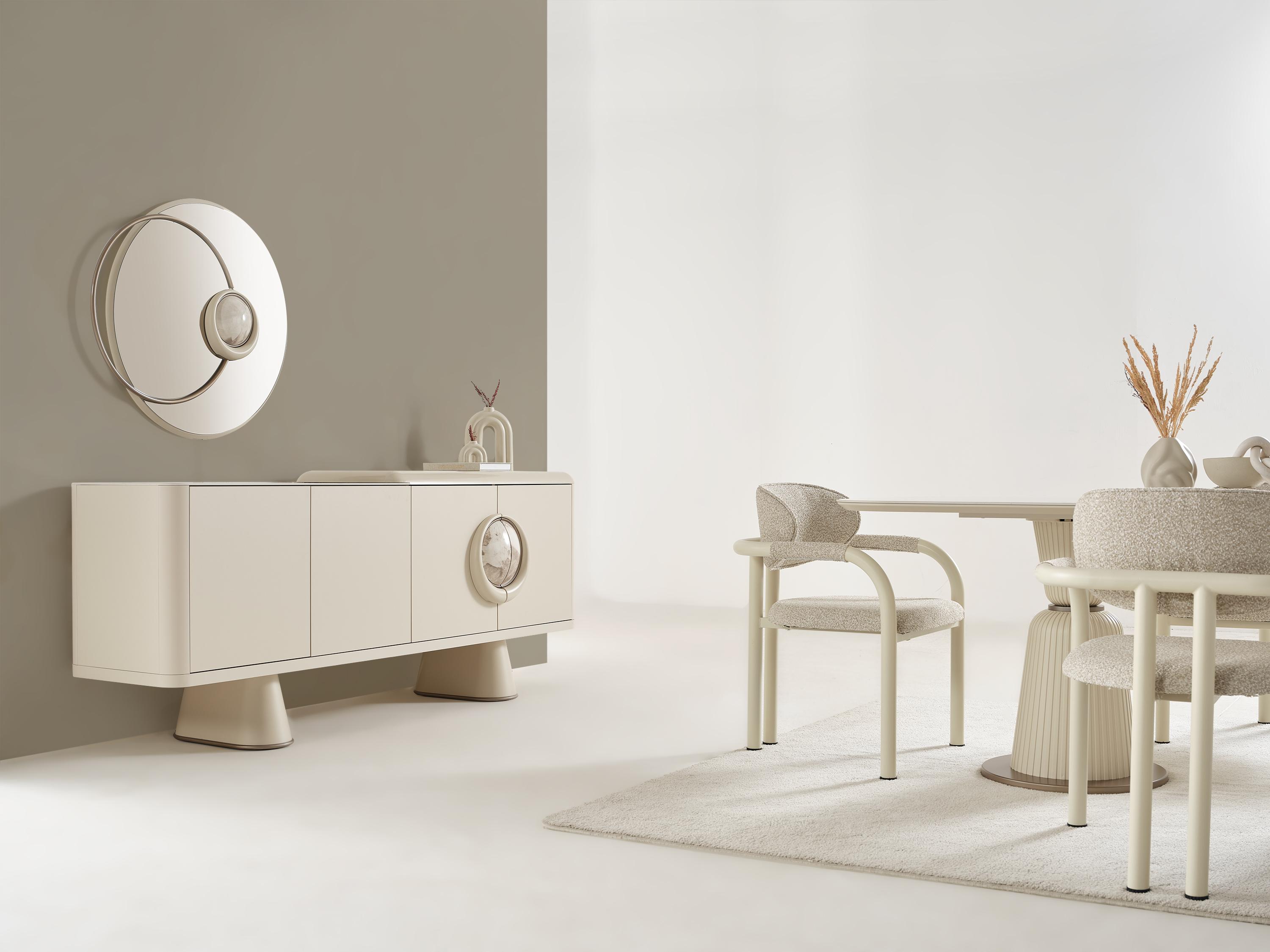 İsviçre’nin sade lüks anlayışından ilham alan bu tasarım; abartıdan uzak, detaylarda saklı zarafeti ön plana çıkarır. Ergonomik sandalyeleri, konforlu oturum yapısı ile uzun yemek davetlerini keyifli hale getirirken; konsol ve ayna tasarımı mekâna bütüncül bir estetik kazandırır.