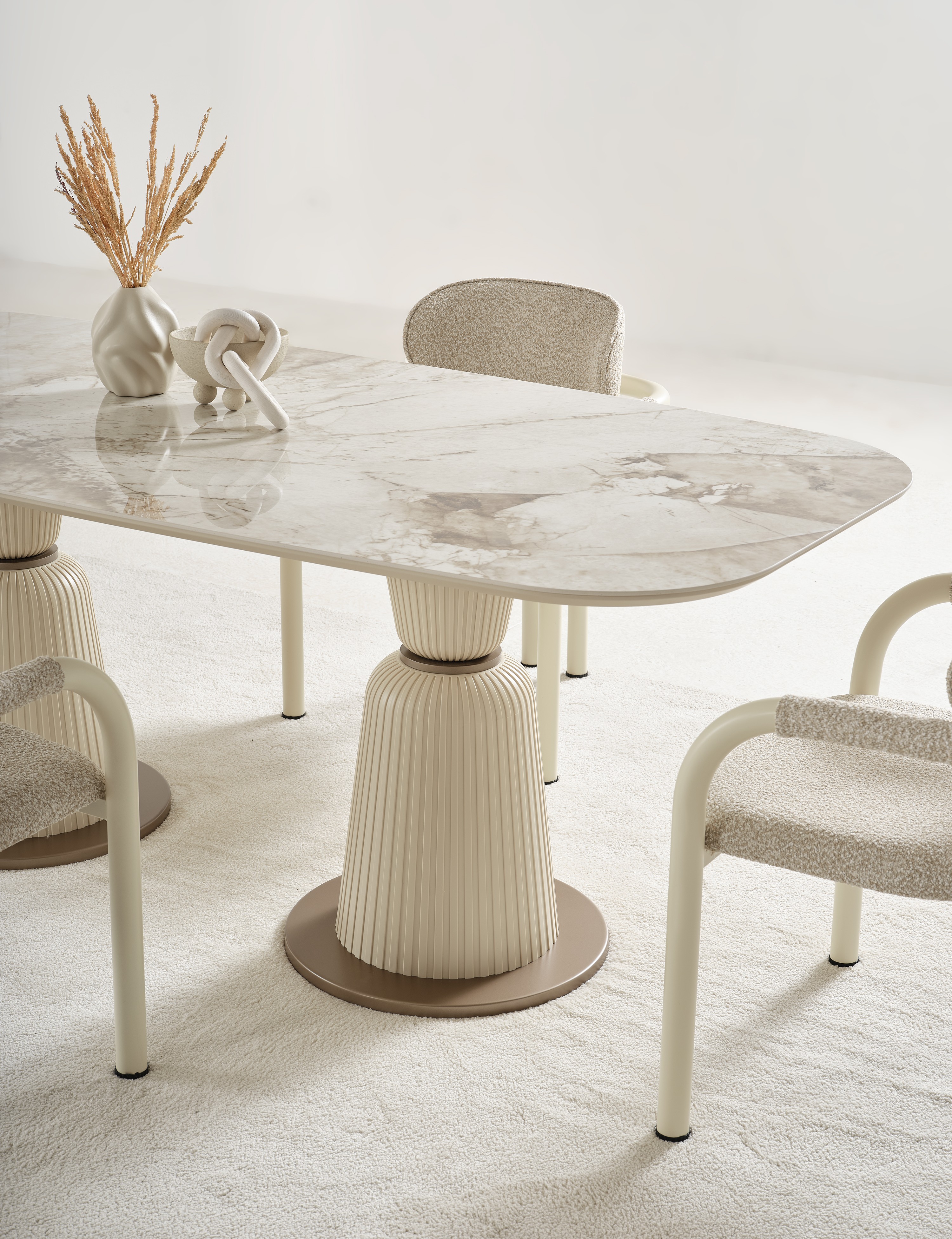Akıcı formlar, yumuşak dokular ve modern çizgilerin uyumu sayesinde Zürih Yemek Odası Takımı, yalnızca bir yemek alanı değil; stil sahibi yaşamın güçlü bir yansımasıdır.